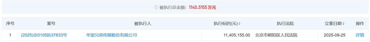 在电影小镇被全资收购不久后,9月25日,华谊兄弟新增一则被执行人信息。据天眼查APP,该执行标的1140万余元,执行法院为北京市朝阳区人民法院。