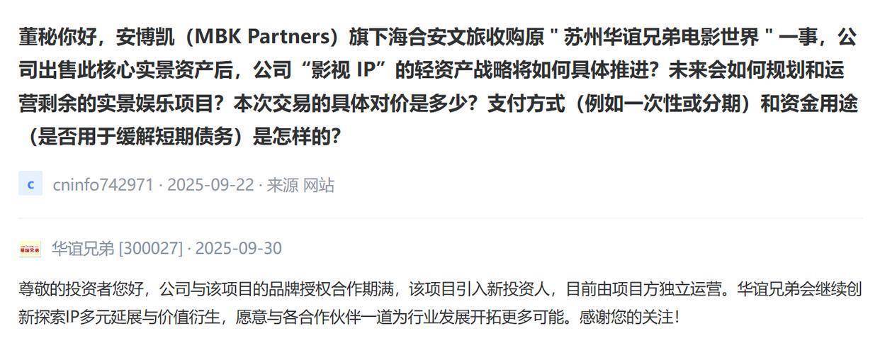 9月30日,“公司出售此核心实景资产后,公司影视IP的轻资产战略将如何具体推进?未来会如何规划和运营剩余的实景娱乐项目?”对于海合安文旅收购原“苏州华谊兄弟电影世界”一事,华谊兄弟(300027)在互动平台进行回复。